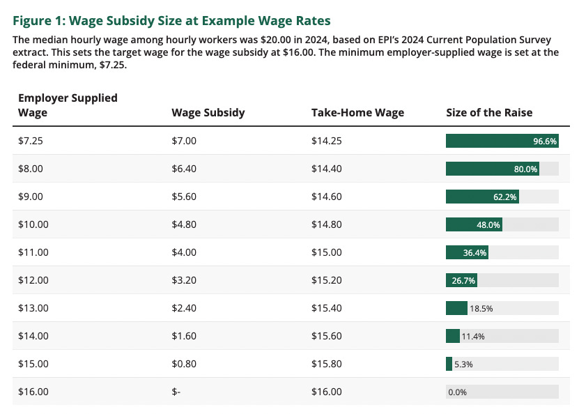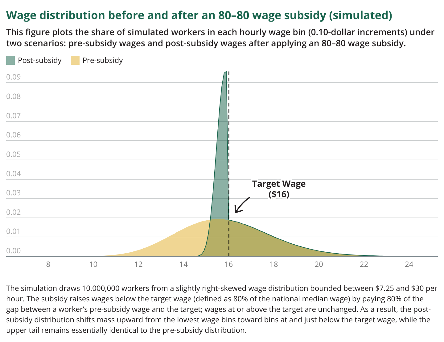 A wage subsidy is a publicly funded top-up to low hourly wages. Our proposal outlined a subsidy equal to 80 percent of the difference between a worker’s employer-paid wage and a target hourly wage set at 80 percent of the national median ($16 in 2024).