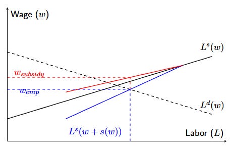 When we put those two things together, we get the post-subsidy labor supply and labor demand curve above. For wages where s(w) > 0, the labor supply curve shifts to the right because workers behave as if the wage is w+s(w). The new equilibrium features higher employment and (in the frictionless competitive incidence case) a lower employer-paid wage than before, called w_emp, because the market is clearing with more labor than before. We have moved down the labor demand curve. Workers do not experience a lower wage though. The post-subsidy received wage is: