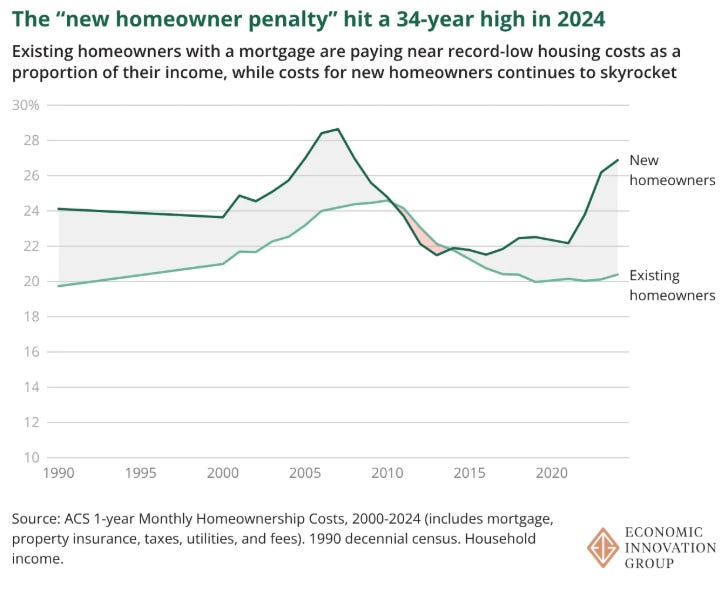 “New homeowners are now burdened with some of the highest housing costs in decades,” writes Jess Remington, “while existing homeowners — those who have owned their homes for longer than a year — are actually spending less on housing than in the past.” The new homeowner penalty, which refers to housing costs for new homeowners above those paid by existing homeowners, hit a 34-year high in 2024. Just as worrying is that too many of the housing policies favored by policymakers would widen the gap even further.