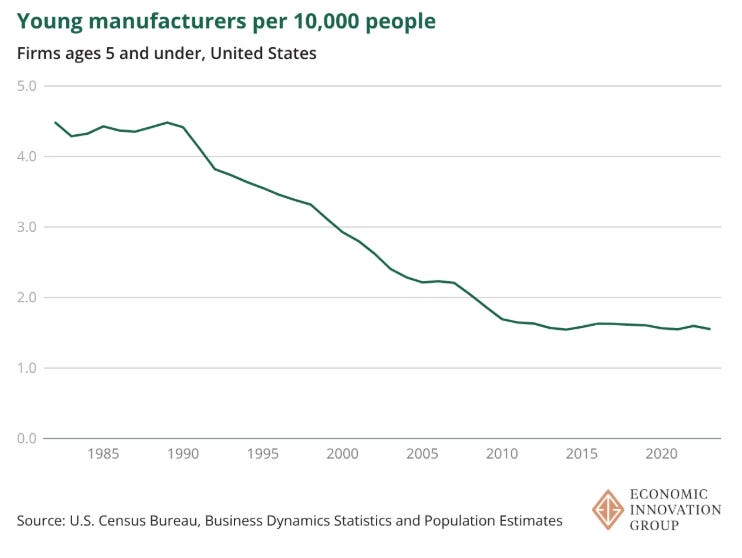 Kenan Fikri looks at the economic geography of manufacturing activity across the country and finds that new manufacturing is now “avoiding hubs of established prowess and instead gravitating towards places with little history in manufacturing. This tendency is not new. A fact of modern U.S. manufacturing appears to be that it trends towards deagglomeration.” Among other discoveries, Kenan also finds that the United States “has only 1.5 young manufacturing firms per 10,000 people today — a figure that has been bumping along at all-time lows for 15 years and counting.”