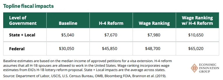 As EIG has argued previously, the H-1B program leaves much room for improvement. This report models the fiscal impact at the federal level and the state level of implementing two high-leverage reforms: authorizing H-1B holders’ spouses to work in the United States, and changing the H-1B selection process from a lottery to a wage-rank system. Combining our two reform proposals would more than double the positive fiscal impacts, to $65,020 at the federal level and $10,650 at the state level.
