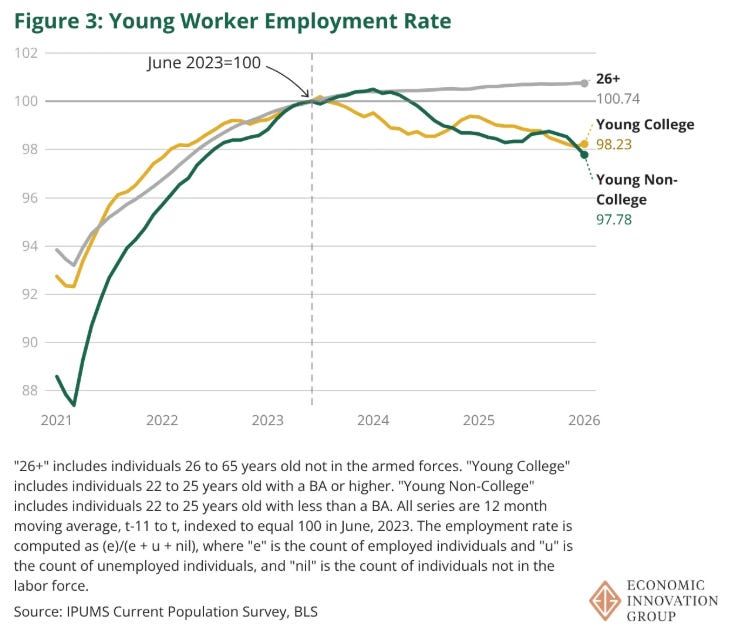 To understand what’s happening in the labor market for young adults, it’s necessary to look at the employment rate for college and non-college workers. Both are lagging behind the employment rate for adults older than 25. Something mysterious is happening, but as Adam Ozimek and Nathan Goldschlag write, this does not seem like a story about AI displacing entry-level college graduates.