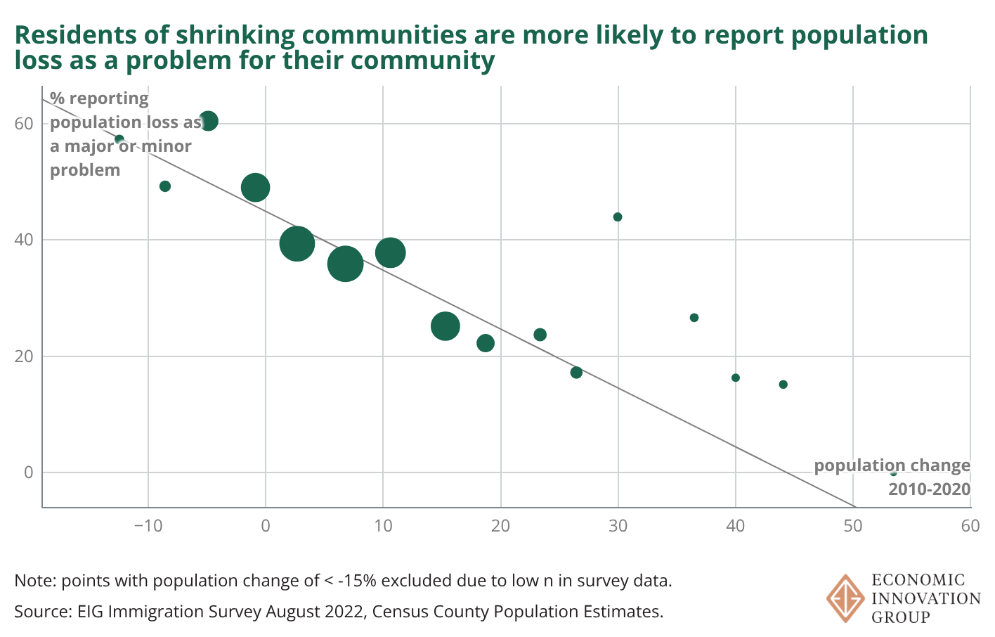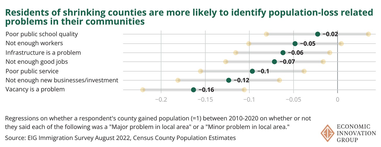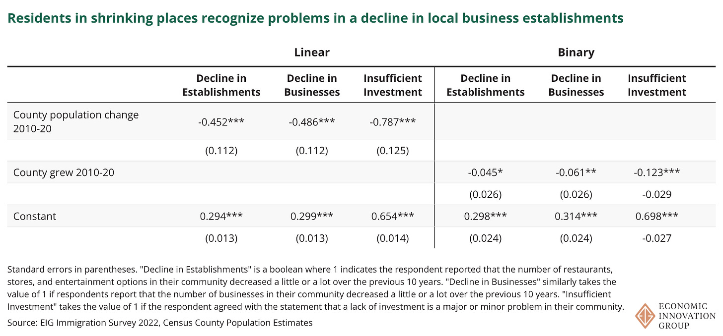 What’s more, another survey question illustrates that the lack of new businesses rises to the level of concerning in demographically struggling places. Individuals reported whether a lack of new businesses or investment is a problem in their community, and regression analysis shows this is statistically significant related to population change. A 1 percentage point decrease in population growth is associated with a 0.79 percentage point increase in concern about insufficient investment and a 0.49 percentage point increase in concern about business decline.