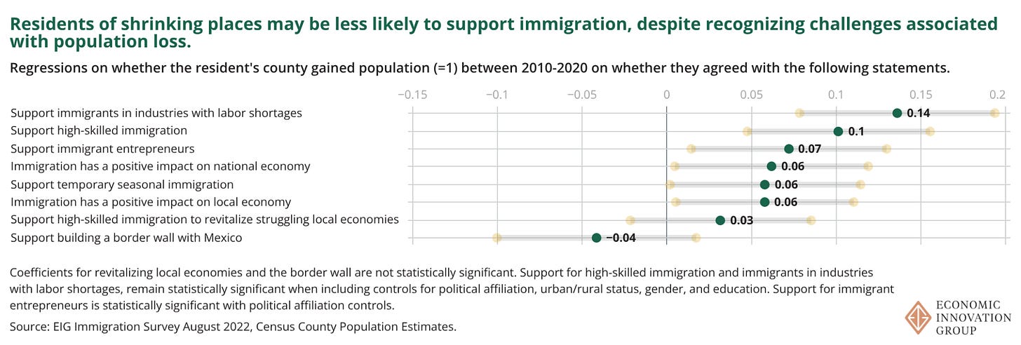 Residents of shrinking communities are less likely to view immigration as a net positive for the local or national economy, and are less supportive of temporary seasonal migration and immigration designed to address labor shortages. They are less likely to support high-skilled immigration even if it is framed as supporting entrepreneurship.